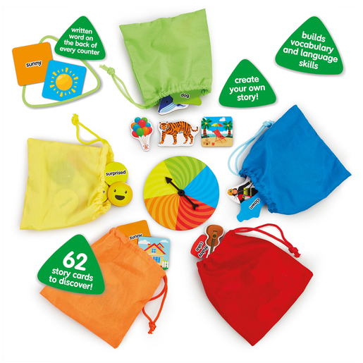 - Includes: 1x spinner, 5x fabric bags, 14x object story cards, 14x animal story cards, 14x character story cards, 10x emotion story cards, 10x scene story cards and 1x instruction leaflet